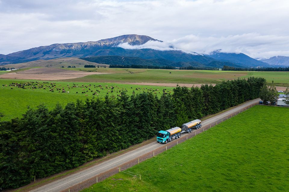 Dairy's milk tanker truck travels through pastures on West Coast