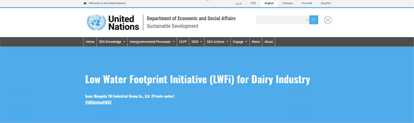 Water resources play a vital role in ensuring the survival and progress of human beings. But unfortunately, we are facing a global water crisis due to the scarcity of water resources and the escalating problem of water pollution. To tackle this pressing issue, Yili is committed to promoting efficient utilization and management of water resources. By harnessing new technologies, Yili aims to reduce water consumption and enhance water resource management. Our goal is to contribute to the sustainable development of water resources, ensuring a better future for generations to come. By proposing the "Low Water Footprint Initiative (LWFi) for Dairy Industry", Yili has become China's first company to join the UN Water Action Agenda at the UN Water Conference held in March 2023.