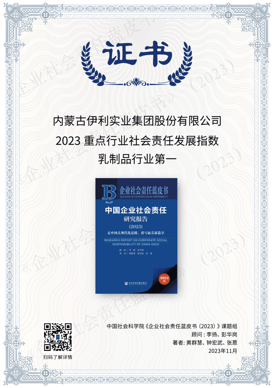 2023年11月16日,第六屆北京責任展暨《企業社會責任藍皮書(2023)》發布會在北京召開,國務院國資委原黨委委員、秘書長彭華崗,中國社會科學院經濟研究所所長黃群慧等出席。在活動中,伊利集團發布了2023年“十大ESG案例”,并榮獲中國社會科學院《企業社會責任藍皮書(2023)》“乳制品行業社會責任發展指數(2023)第一”,這也是伊利連續第6年獲得該榮譽。會上,伊利和國資委、中國社科院、央企的代表一起啟動了中國ESG研究十大課題(2024)。