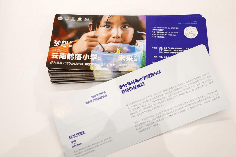 為了讓更多人關(guān)注并參與到“伊利營養(yǎng)2030”公益行動中來,展覽還特別設(shè)計了可投遞“夢想車票”。車票上展示了“伊利營養(yǎng)2030”公益行動重要的5個站點,參觀者可以在展區(qū)領(lǐng)取“夢想車票”,并寫下給孩子們的夢想寄語,投遞到專門設(shè)置的“夢想信箱”中,“伊利營養(yǎng)2030”公益項目團(tuán)隊將把這些寄語和祝福帶給遠(yuǎn)方的孩子們。
