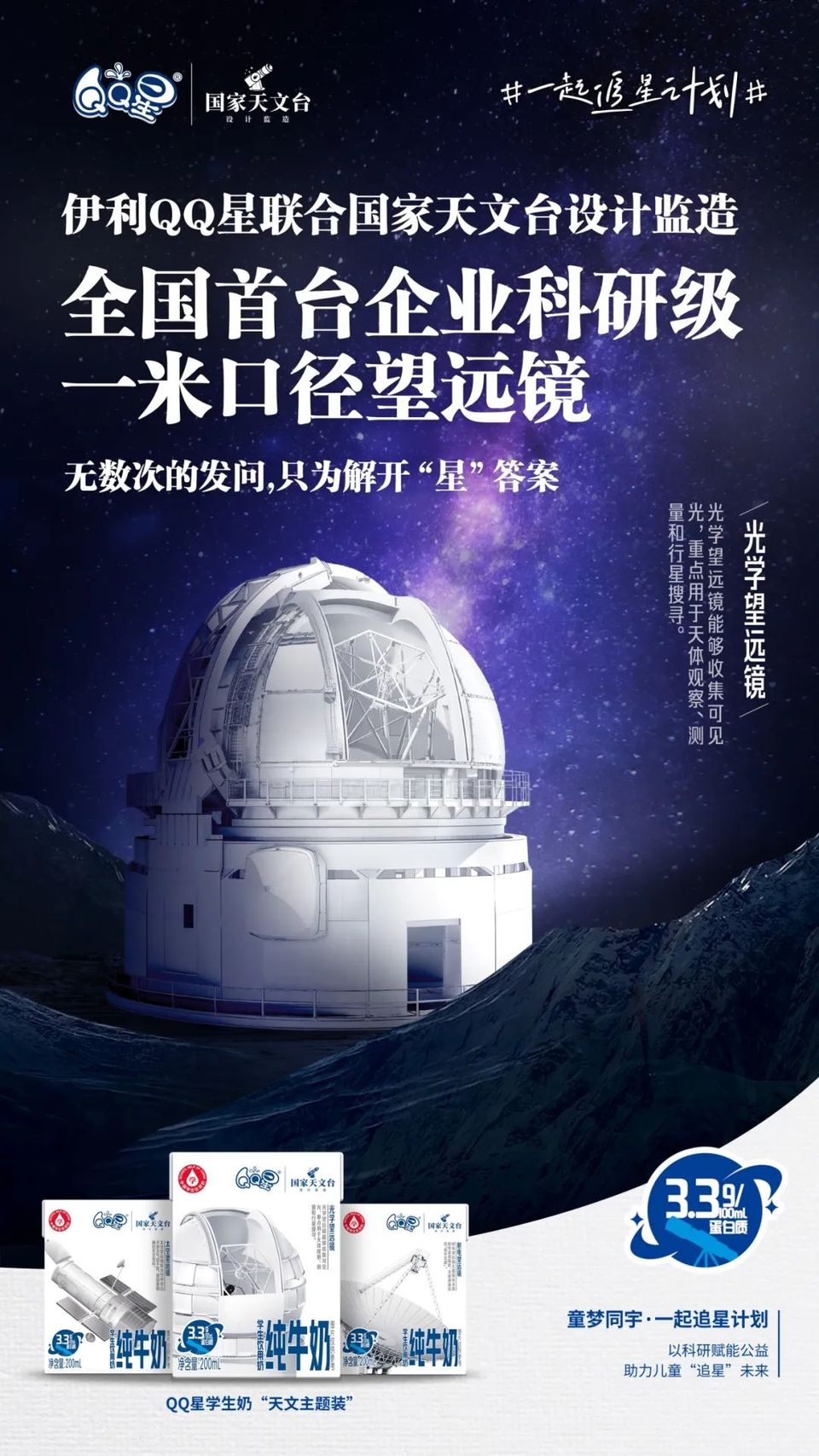 此次“一起追星計(jì)劃”投建的“大視場巡天望遠(yuǎn)鏡”將能夠幫助熱愛天文科學(xué)的孩子們更清晰地觀測天體和科學(xué)地分析天體運(yùn)行規(guī)律,更好地滿足他們對(duì)浩瀚宇宙的好奇心和求知欲,助力孩子們天文夢(mèng)想的實(shí)現(xiàn)。同時(shí),為了把天文知識(shí)帶給更廣泛的青少年群體,伊利QQ星品牌為“一起追星計(jì)劃”特別設(shè)計(jì)了天文科普概念版學(xué)生奶。通過在瓶身上印制經(jīng)過科學(xué)審定的天文知識(shí),讓更多青少年在飲用牛奶的同時(shí)獲得知識(shí)和營養(yǎng)的雙倍支持。
