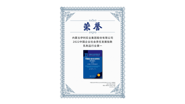 2022年11月20日,第五屆北京責任展暨《企業社會責任藍皮書(2022)》發布會在北京召開,伊利榮獲中國社會科學院《企業社會責任藍皮書(2022)》“2022中國企業社會責任發展指數乳制品行業第一”,這也是伊利第5次獲得該榮譽。